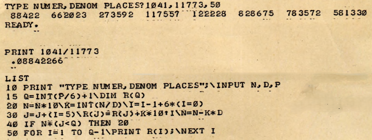 Stored_Division.bas =================== 0 REM Original author: Steven A. O'Hara, Fall 1972 5 I=0\J=0 10 PRINT "TYPE NUMER,DENOM PLACES";\INPUT N,D,P 15 Q=INT(P/6)+1\DIM R(Q) 20 N=N*10\K=INT(N/D)\I=I-1+6*(I=0) 30 J=J+(I=5)\R(J)=R(J)+K*10^I\N=N-K*D 40 IF N*(J<Q) THEN 20 50 FOR I=1 TO Q-1\PRINT R(I);\NEXT I Parsed Basic Stored_Division.bas in 5 ms. Parse steps = 1,483. Tokens = 350. 8 lines, about 1,600 lines per second Created XML file Stored_Division_bas.xml, tokens = 350. TYPE NUMER,DENOM PLACES?1041,11773,50 88422 662023 273592 117557 122228 828675 783572 581330 |