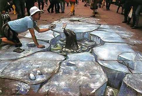 Julian Beever is an English artist who's famous for his art on the pavement of England, France, Germany, US, Australia and Belgium. Note that all images are completely flat!