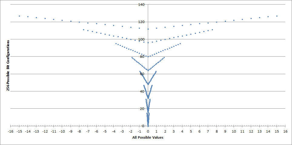 For our simplified example, there are only 256 possible floating point numbers (because there are only 8 bits total, and 28 is 256). The actual possible values look like the following graph.